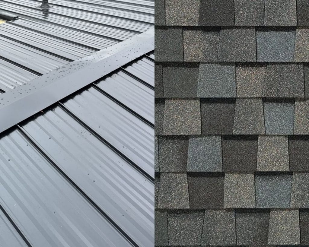 A side by side comparison showing the layered structure of asphalt shingles and the interlocking panels of a metal roofing system.